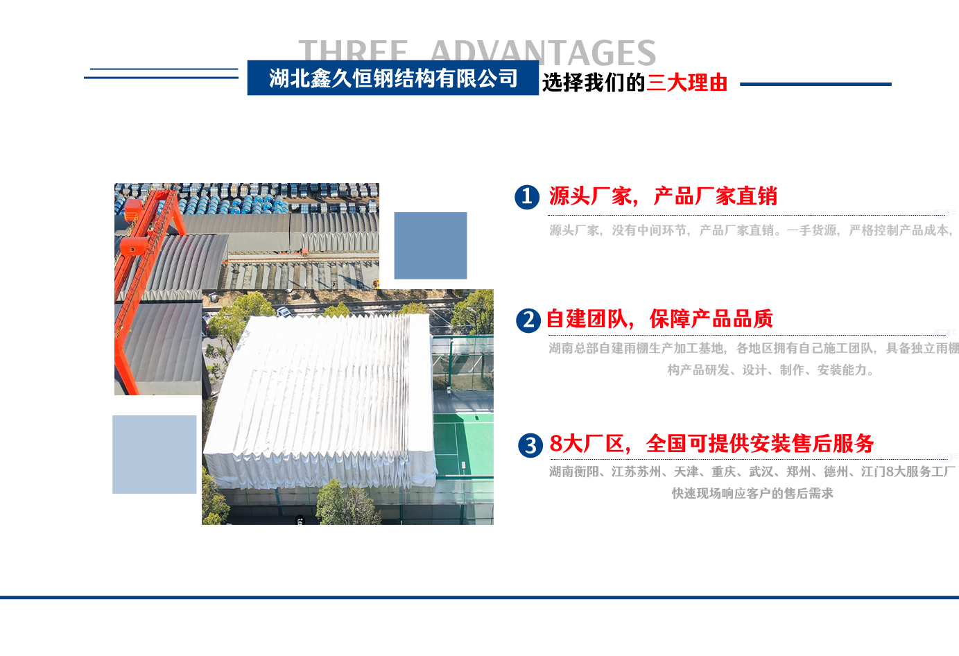 湖北鑫久恒鋼結(jié)構(gòu)有限公司是一家電動(dòng)雨棚、膜結(jié)構(gòu)車棚研發(fā),生產(chǎn)銷售,施工安裝于一體的專業(yè)鋼結(jié)構(gòu)科技公司,主要產(chǎn)品有伸縮雨棚,電動(dòng)雨棚,膜結(jié)構(gòu)車棚等?! 『系貐^(qū)職員目前有80多人,占地面積20000平方米,廠房面積15600平方米,配備先進(jìn)的生產(chǎn)流水線,使每件品質(zhì)產(chǎn)品的堅(jiān)實(shí)基礎(chǔ)?! 」驹谔K州、天津、重慶、武漢、德州、烏魯木齊、江門均設(shè)有服務(wù)工廠,總?cè)藛T共300多人,擁有專業(yè)的技術(shù)團(tuán)隊(duì),配備先進(jìn)的設(shè)備和流水線生產(chǎn),產(chǎn)能高,貨源充足,發(fā)貨速度快,服務(wù)區(qū)域廣?! ∫苿?dòng)伸縮棚適用于通道臨時(shí)倉儲(chǔ)、戶外運(yùn)動(dòng)遮陽、污水池遮蓋、能源交通、熱力化工、礦山、船舶制造及市政建設(shè)、物流、碼頭等領(lǐng)域的構(gòu)件制作加工,成品半成品存放、倉庫、野外儀器設(shè)備操作用房等。尤其是對(duì)工廠發(fā)貨、倉儲(chǔ)臨時(shí)遮雨防嗮,梅雨期較長、建設(shè)周期較短的工程施工等特別適用。還可根據(jù)用戶需求量身定制、適合企業(yè)所需不同款式的產(chǎn)品?! ∥夜緢?jiān)持“誠信社會(huì)為本,客戶滿意為榮”的經(jīng)營理念,做到質(zhì)量把控,嚴(yán)格管理,精益求精,恪守承諾。使鑫久恒逐步走向成熟,其系統(tǒng)化、專業(yè)化日趨完善。以專業(yè)的技術(shù)、科學(xué)的管理,更高的產(chǎn)品質(zhì)量,優(yōu)良的企業(yè)信譽(yù),真誠的客戶服務(wù),靈活多樣的經(jīng)營方式和務(wù)實(shí)創(chuàng)新的企業(yè)精神愿與社會(huì)各界攜手合作,為推動(dòng)智能鋼結(jié)構(gòu)建筑事業(yè)的發(fā)展而不斷努力。...
